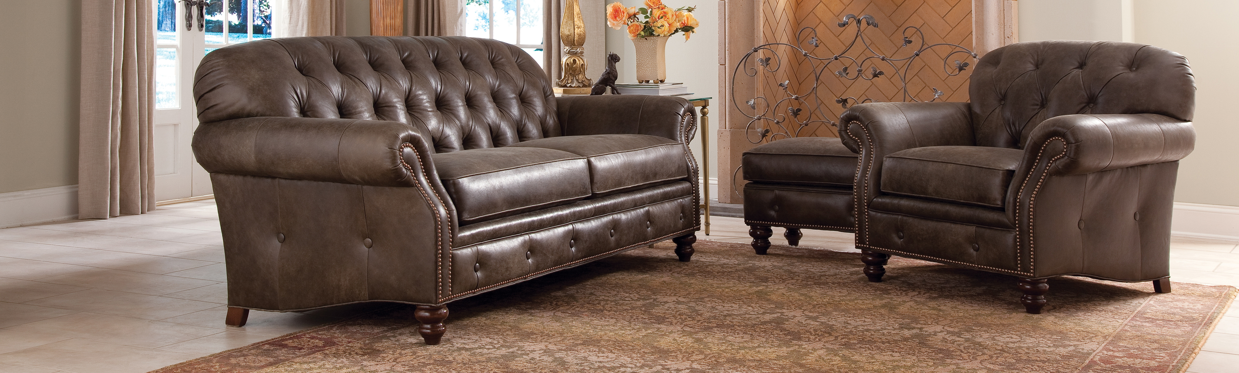 This 396 sofa collection will add classic elegance to your traditionally styled living room. Its formal beauty is demonstrated by button-tufting, nailhead trim and turned feet. Another interesting feature of this collection is the unique comfort wrinkles that are designed to enhance the exceptionally soft feel of the seat and back cushions. Pair these pieces with the matching loveseat (not pictured).